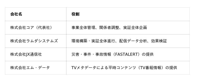 株式会社コア(本社:東京都世田谷区、代表取締役 社長執行役員:横山 浩二、以下 コア)を代表社とする4社は、東京都デジタルサービス局が実施する令和7年度東京データプラットフォーム ケーススタディ事業に「フェーズフリーの地域密着型情報配信プロジェクト」が採択され、共同実証事業に着手することをお知らせいたします。