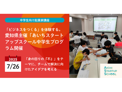 愛知県が主催する「あいちスタートアップスクール」(運営:ミテモ株式会社)は、2025年7月20日と、2025年7月26日の2日間にわたり、中学生向けの「あいちスタートアップスクール」をオンライン/刈谷市、小牧市、豊橋市、日進市の4会場同時に開催することをお知らせします。