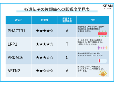 「ゲノムや遺伝子が身近になる社会を創っていく」ことを目指してサービスを展開する株式会社KEAN Health(本社:東京都港区)は、で湿度の高い環境で体がうまく体温調節できない「湿気疲れ」のシーズンに合わせて片頭痛に影響する遺伝子早見表を作成しました。