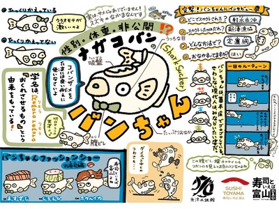 寿司といえば富山DAOと魚津水族館が協力し、魚津水族館で展示されているコバンザメの「バンちゃん」をより幅広い層に親しんでもらえるようイラスト化しました。「バンちゃん」が展示されている富山湾大水槽にフォトスポットとしてイラストが掲示されます。