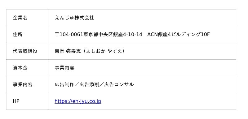 えんじゅ株式会社(本社:東京都中央区 代表取締役:吉岡弥寿恵)は、「縁を寿(ことほ)ぐ=ご縁を大切にし、育てていく」という想いを社名に込め、広告で売るための添削・制作・コンサル事業を展開してきました。