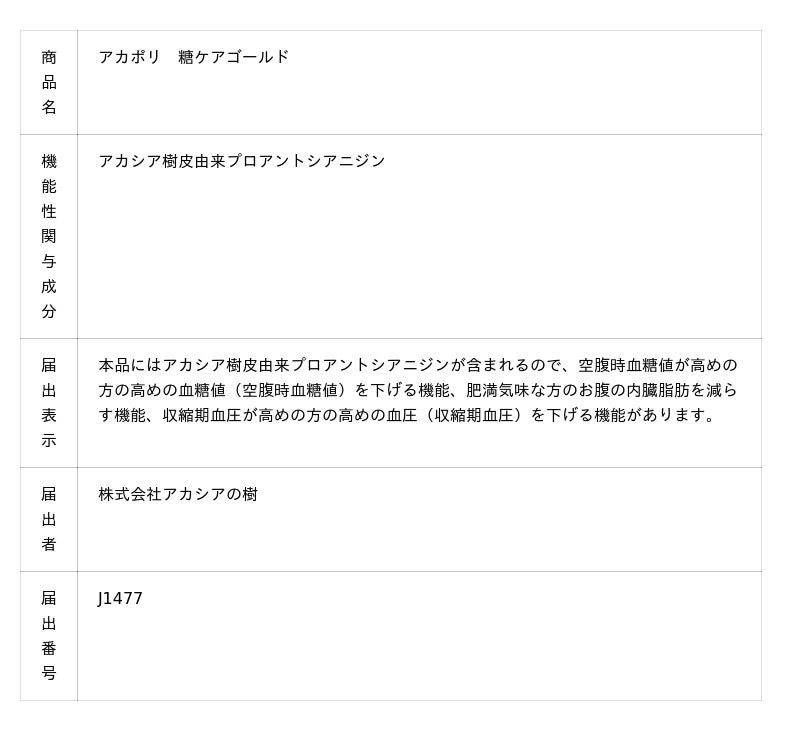 株式会社アカシアの樹(本社 広島県 廿日市市)は、機能性表示食品制度に基づき届出を申請した「アカポリ 糖ケアゴールド」が消費者庁に受理(J1477)されましたのでお知らせいたします。
