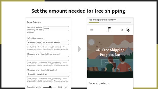 「UR: Free Shipping Progress Bar」は、顧客の購買意欲を高める送料無料プログレスバーをノーコードで簡単に設置できるShopifyアプリです。カート金額に応じて送料無料までの残額をリアルタイムで表示し、視覚的に購入を促進します。バーのデザインや色、テキストは自由にカスタマイズ可能で、ストアのブランドイメージに合わせた最適な表示が実現できます。1クリックでテーマに追加でき、専門知識不要で誰でも簡単に導入可能。カート落ちを防ぎ、平均注文金額の向上に貢献する効果的なマーケティングツールです。