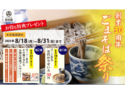 これまでのご愛顧への感謝をこめて、2025年8月に全国の直営・FC店舗にて「高田屋 創業30周年記念キャンペーン」を開催いたします。30年にわたり、和食とごまそばを中心とした店舗運営を続けてこられたことは、ひとえにお客様・お取引先様の支えあってのことと、心より御礼申し上げます。
