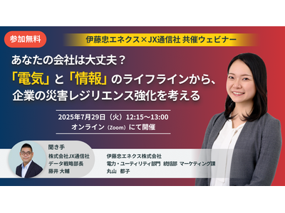 防災DXを推進する報道ベンチャーの株式会社JX通信社(東京都千代田区、代表取締役 米重 克洋、以下「JX通信社」)と、伊藤忠エネクス株式会社(東京都千代田区、代表取締役社長 田畑 信幸、以下「伊藤忠エネクス」)は、7月29日(火)に共催ウェビナーを開催することをお知らせします。