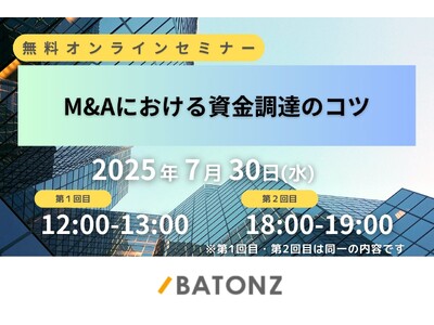 M&A・事業承継支援プラットフォーム「BATONZ(バトンズ)」を運営する株式会社バトンズ(本社:東京都中央区、代表取締役CEO:神瀬悠一、以下バトンズ)は、ミュージックセキュリティーズ株式会社(本社:東京都千代田区、代表取締役社長:中園浩輝、以下ミュージックセキュリティーズ)との共催で、「M&Aにおける資金調達のコツ」と題したオンラインセミナーを2025年7月30日(水)に開催します。