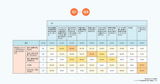Q5で「どちらでもない」「あまりそう感じていない」「全くそう感じていない」と回答した方に、「Q8.コーチングが自分にとってあまり役に立たなかったと感じた理由として、当てはまるものを教えてください。(複数回答)」(n=91)と質問したところ、「実務に活かせる内容ではなかった」が25.3%、「自分が何を話したいのか分からず、十分に活用しきれなかった」が16.5%、「そもそも自分があまり前向きに取り組めていなかった」が16.5%という回答となりました。