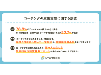 株式会社Smart相談室(本社:東京都港区、代表取締役・CEO:藤田 康男)は、外部の専門家(コーチ)による1対1のビジネスコーチングを受けた経験がある会社員430名を対象に、コーチングの成果実感に関する調査を実施しましたので、お知らせいたします。