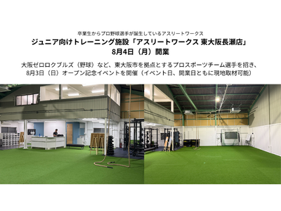 プロ野球選手を育んだジュニア特化型トレーニングを提供する株式会社アスリートワークス(本社:大阪市 以下、当社)は、当社トレーニング施設では最も面積の広い店舗となる「アスリートワークス 東大阪長瀬店」を2025年8月4日(月)にオープンいたします。