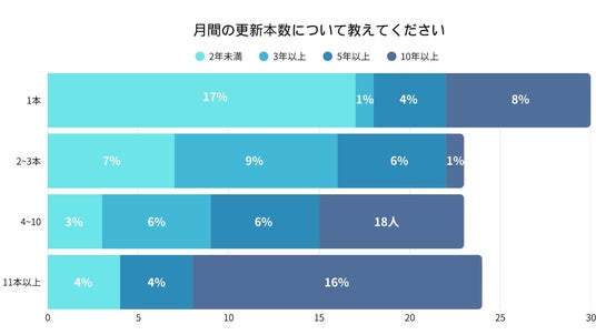 「月間の記事の更新本数について教えてください」という問いに対して、1本と答えたのは30名、2~3本と答えたのは23名、4~10本と答えたのは23名、11本以上と答えたのは24名でした。11本以上と答えた24名のうち、16名は10年以上メディアを運営しており継続的に運営しているメディアほど高い更新頻度を維持しているということが分かります。