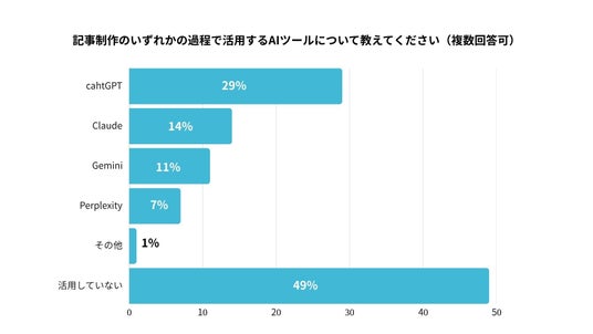 「記事制作のいずれかの過程で活用するAIツールについて教えてください」という問いに対しては約半数が活用しており、その内の6割近くが、chatGPTを活用していることが分かりました。一方、使用感については様々な意見があり、活用の工夫次第では生産性向上に繋がるもののまだまだ本格運用に至っていない現状が分かりました。