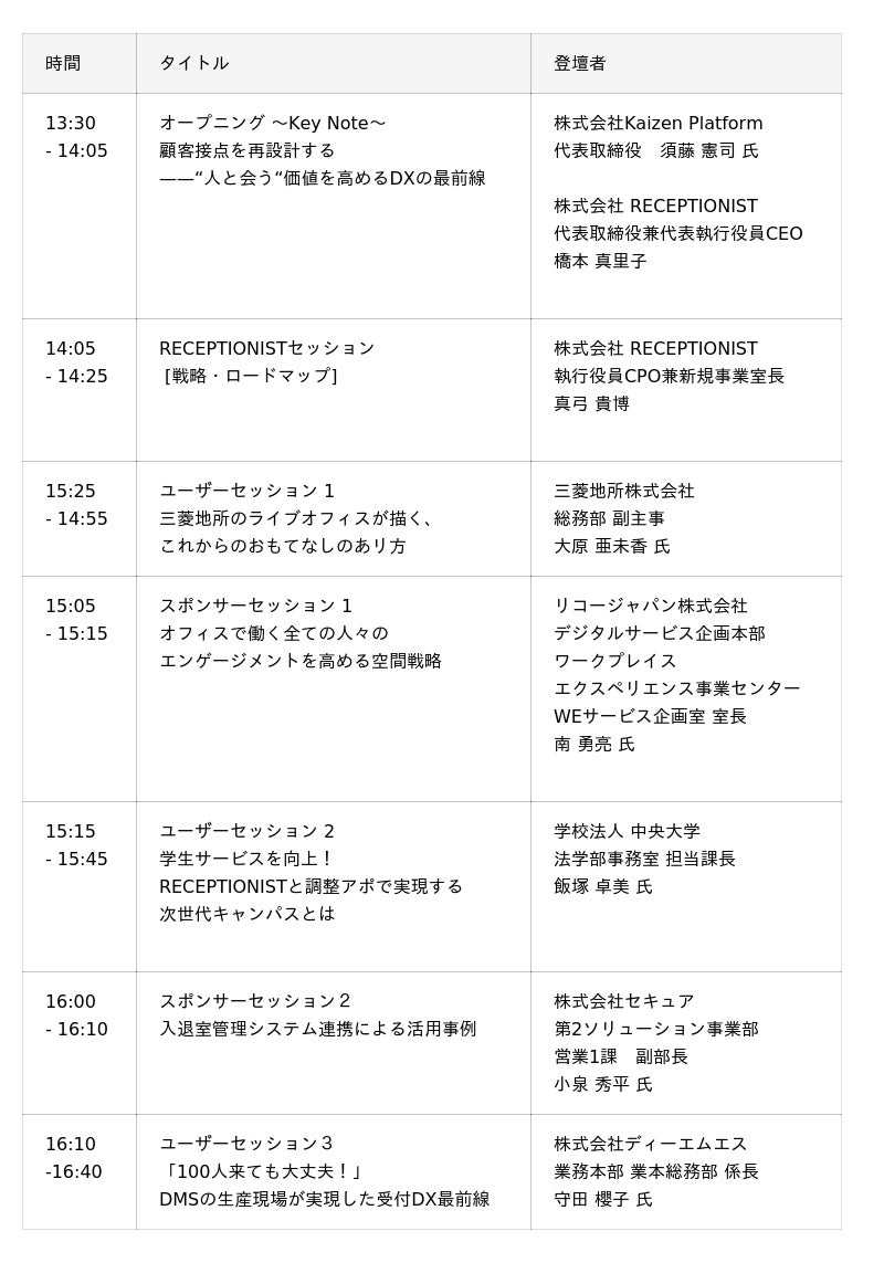 このイベントでは、実際にRECEPTIONISTシリーズを導入している企業の皆さまに登壇いただき、導入までの経緯や工夫、運用のコツについてリアルな声をお話しいただきます。
