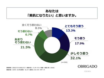 株式会社ビエスト化粧品(本社:大阪府大阪市、代表取締役:國澤 和人)が提供する「OBRIGADO」は、30代~50代の男性を対象に「男性の“美肌”に対する願望とスキンケア」に関する調査を実施しました。この調査から、30代~50代の男性の美肌に対する意識と願望、スキンケア実施率とその内容、スキンケアをしている理由などが明らかになりました。