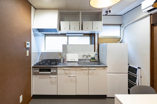 キッチン兼ダイニングには、冷蔵庫、電子レンジ、炊飯器などの家電や調理器具、食器が揃っており、もちろんWi-Fiもございます。