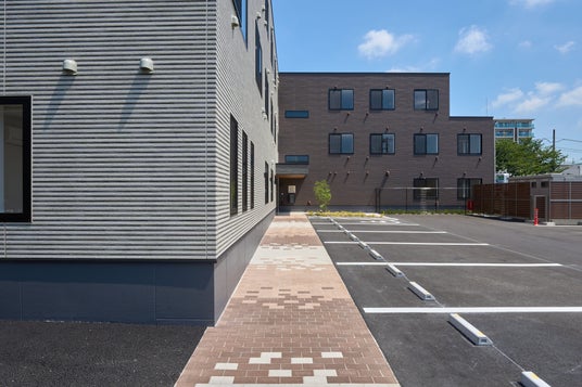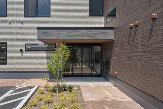 外壁はクリーム×ブラウンの配色で構成されており、視認性に優れ、建物の輪郭が明瞭に把握できるよう設計されています。施設のすぐそばには街路樹が並び、四季折々の表情を見せてくれます。