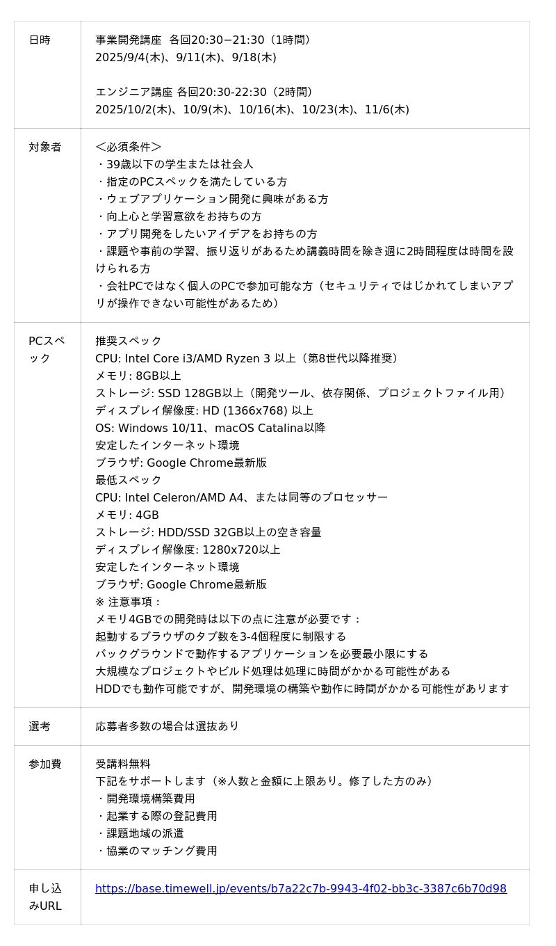 株式会社TIMEWELL(本社:神奈川県横浜市、代表取締役:濱本隆太、以下TIMEWELL)は、東京都の多様な主体によるスタートアップ支援展開事業「TOKYO SUTEAM」の協定事業者として、事業支援やアプリ開発、登記や実証実験まで、一部費用も含めてサポートし自ら開発できる、若手テクニカルアントレプレナー育成プログラム「WARP」※(以下WARP)の受講生の募集を開始します。2025年7月31日から第4期である9月開始分の受講生の募集を開始いたします。