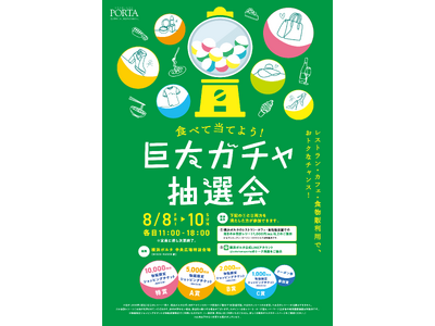 横浜新都市センター株式会社(横浜市西区高島2丁目12番6号/取締役社長 原田 一之)が運営・管理する横浜駅東口地下街ポルタでは2025年8月8日(金)から8月10日(日)の3日間限定で「食べて当てよう!巨大ガチャ抽選会」を開催いたします。