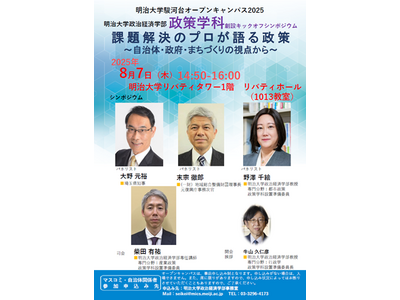 明治大学政治経済学部は8月7日(木)駿河台キャンパスでのオープンキャンパスのプログラムの一環として、政策学科創設キックオフシンポジウム「課題解決のプロが語る政策~自治体・政府・街づくりの視点から~」を開催します。