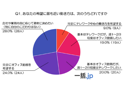 - 一方、「基本はテレワークだが、週1~2日はオフィス勤務したい」は19.0%(19人)、「完全にテレワーク中心の働き方を希望する」は9.0%(9人)にとどまりました。