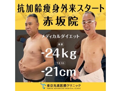 東京先進医療クリニック赤坂院(所在地:東京都港区赤坂)は、「抗加齢痩身外来(メディカルダイエット)」を2025年夏より本格始動いたしました。今回の発表にあたり、当院の総括院長であり、美容外科医として多数の実績をもつ麻生泰(あそう・とおる)自らが“モデル患者”となり、実際に24kgの減量・ウエストマイナス21cmのダイエットに成功。