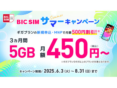 ビックカメラグループが提供する「BIC SIM powered by IIJ(以下、BIC SIM)」は、2025年8月31日まで、「BIC SIMサマーキャンペーン」を開催中です。ギガプランの月額料金が3ヵ月間最大500円割引、通話定額オプションを3ヵ月間0円でご利用いただけるお得なキャンペーンをお見逃しなく!