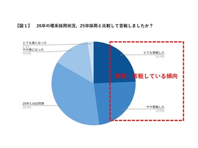 理系学生の採用状況に関しては、26年卒も前年と比較して「とても苦戦した」(24.4%)、「やや苦戦した」(23.5%)で約半数の企業が苦戦していることを実感しています。(図1)