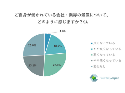 自身が働かれている会社・業界の景気について、どのように感じるか聞いたところ、「悪くなっている」が27.4%、「変化なし」が26.0%、「やや悪くなっている」が23.1%、「やや良くなっている」が18.7%、「良くなっている」が4.8%という結果だった。