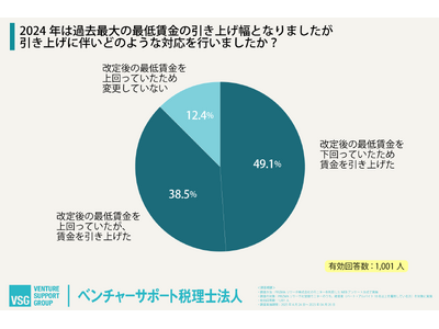 「2024年は過去最大の最低賃金の引き上げ幅となりましたが、引き上げに伴いどのような対応を行いましたか?」と質問したところ、「改定後の最低賃金を下回っていたため、賃金を引き上げた(49.1%)」「改定後の最低賃金を上回っていたが、賃金を引き上げた(38.5%)」「改定後の最低賃金を上回っていたため、変更していない(12.4%)」という回答結果となった。