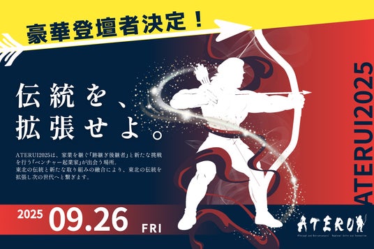 「ATERUI(Atotsugi and Enterpreneurs’ Regional Unity and Innovation)2025」(以下、「ATERUI2025」)は、「伝統を、拡張せよ。」をコンセプトに掲げ、東北ならではの伝統や資源を活かしながら挑戦を続ける跡継ぎ経営者やベンチャー起業家、支援機関、地域企業など、多様なプレイヤーが一堂に集結する東北最大級のビジネスカンファレンスです。