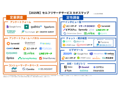 セルフ型アンケートツール「Surveroid」を提供する株式会社マーケティングアプリケーションズ(本社:東京都渋谷区、代表取締役:竹中 司、以下マーケティングアプリケーションズ)は、ダイレクトリサーチサービス「ユニーリサーチ」を提供する株式会社プロダクトフォース(本社:東京都渋谷区、代表取締役CEO:浜岡 宏樹、以下プロダクトフォース)と共同で、主要プレイヤーの洗い出しやカテゴリー検討などの業界分析を重ね、セルフリサーチサービスカオスマップ2025年版を作成しましたので公開いたします。