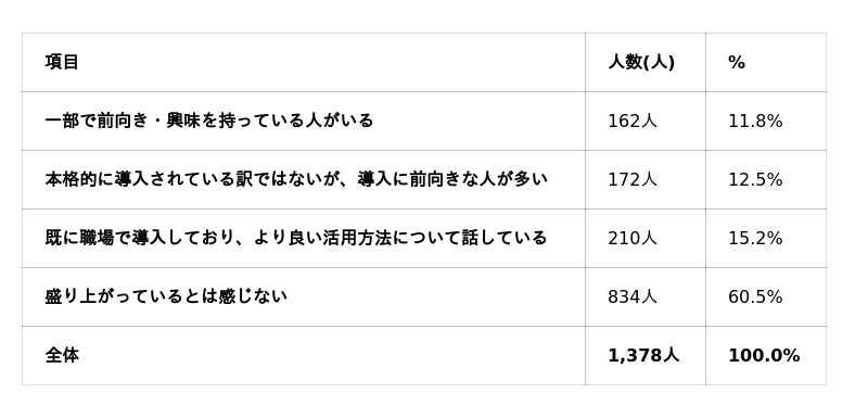Q1.会社員(全1,378名)のうち、職場全体・または一部で生成AIの活用・導入について関心を持って議論している、または導入を進めていると答えた方は全体の39.5%