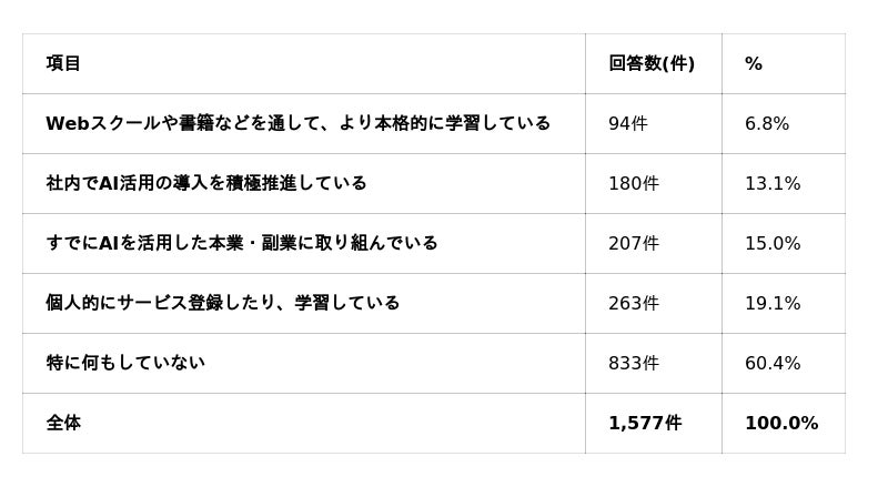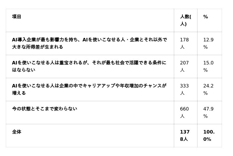 一方、会社員は周囲含めてAI導入などで盛り上がっており、個人も学習に前向きな層と、それ以外の層で行動に大きな差がある状況となっています。