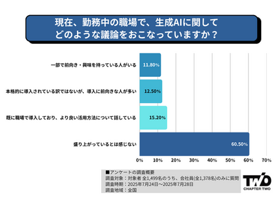 株式会社Chapter Two(東京都港区)の情報メディア「CHAPTER TWO MEDIA」は生成AIに関する認識や社内の取組状況、今後の方針についてアンケート調査をおこないました。