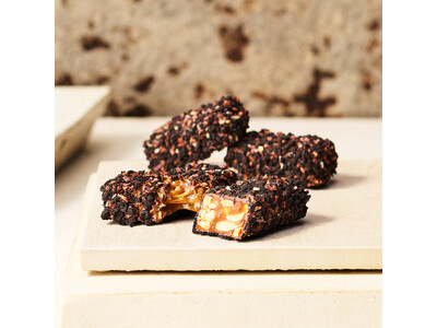 バターや生クリーム、蜂蜜を使ってコク深くなめらかに炊き上げたキャラメルヌガーにローストアーモンドを混ぜ込み、ミルクチョコレートをコーティング。カカオニブとブラッククランチと少しのココナッツをまとわせて、ほろ苦さと奥行きのある香りをプラスしました。