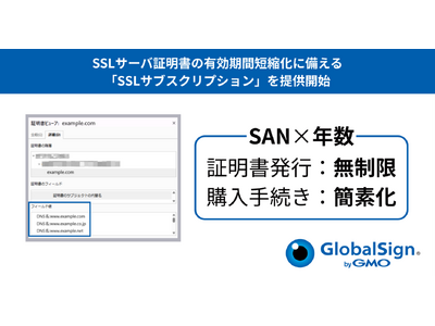 GMOインターネットグループのGMOグローバルサイン・ホールディングス株式会社の連結企業群で、電子認証サービスを展開するGMOグローバルサイン株式会社(代表取締役社長:中條 一郎 以下、GMOグローバルサイン)がSSLサーバ証明書における新たなライセンスモデル「SSLサブスクリプション」を2025年8月5日(火)より販売開始いたします。「SSLサブスクリプション」は、証明書の発行およびSSLサーバ証明書の機能の一つであるSAN(Subject Alternative Name)(※1)の差し替えを同一料金で無制限に行える新サービスです。