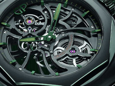 自社製キャリバー GP01800 は、230 年以上にわたって培われてきた時計製造の専門技術をもとに製造しました。55 箇所もの戻り角に施された手仕事による見事な仕上げは芸術的な時計製造技術の証しであり、ブラック PVD 加工が施されたメインプレートとブリッジを備え、面取り、サンドブラスト、サテン仕上げ、サーキュラーサテン仕上げの 4 つの洗練された技法を用い、すべて手作業で装飾されたています。アストンマーティン レーシンググリーンでスケルトン加工されたゴールド製ローターは、針の色合いともマッチしキャリバーに溢れるような光が差し込み、その奥行きを際立たせます。ムーブメントには、非常に優れた調速システムである可変慣性テンプが搭載されているため、耐衝撃性、長期的安定性が強化され、クロノメーター精度も向上しています。パワーリザーブは約 54 時間で、腕元から離れても動作し続けます。腕時計の範疇を超えたオート・オルロジュリーとハイパフォーマンスの洗練された融合であり、精度、美しさ、革新の証です。