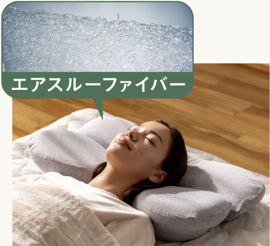 頭が触れる部分に通気性の高い空気繊維素材「エアスルーファイバー」を採用。これにより、首肩まわりはしっかり温めながらも、頭部は熱がこもらず快適。夏でも使いやすい構造です。