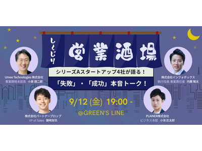 組織に進化をもたらす話術AI「Front Agent」を開発・提供するUmee Technologies株式会社(本社:東京都調布市、代表取締役:新納 弘崇、以下「ユミー」)は、株式会社パートナープロップ(本社:東京都渋谷区、代表取締役:井上 拓海、以下「パートナープロップ」)、株式会社インフォボックス(本社:東京都千代田区、代表取締役CEO:平沼 海統、以下「インフォボックス」)、PLAINER株式会社(本社:東京都渋谷区、代表取締役:小林 大、以下「PLAINER」)と、9月12日(金)19:00-21:00、「しくじり営業酒場」と題して、シリーズAスタートアップ4社の営業責任者による「失敗」「成功」本音トークを開催いたします。