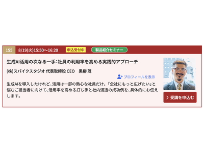 生成AI技術の社会実装を支援する株式会社スパイクスタジオ(本社:東京都港区、代表取締役CEO:黒柳茂 / 代表取締役COO:佐野宏英、以下 スパイクスタジオ)は、こ2025年8月19日(火)~22日(金)に東京ビッグサイトで開催される「DXPO東京’25【夏】」に出展いたします。