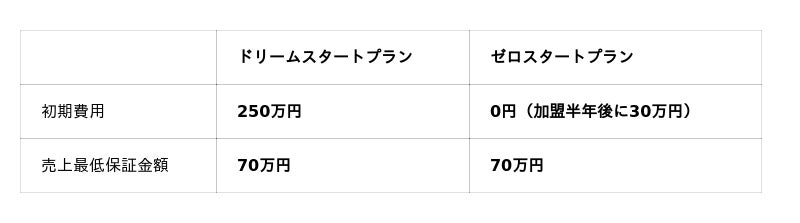 「ドリームスタートプラン」の初期費用は250万円。既存の通常プランよりも低く設定しています。「ゼロスタートプラン」の初期費用は0円で、加盟から6ヶ月後に30万円を支払うシステム。いずれも、自己資金の不足を理由にチャレンジできない現状を打開するための仕組みです。
