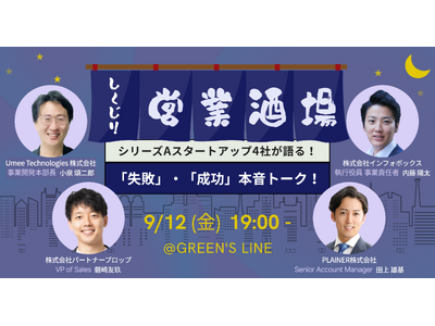 営業データプラットフォームを提供する株式会社インフォボックス(本社:東京都千代田区、代表取締役:平沼海統)は、Umee Technologies株式会社(本社:東京都調布市、代表取締役:新納 弘崇、以下「ユミー」)、株式会社パートナープロップ(本社:東京都渋谷区、代表取締役:井上 拓海、以下「パートナープロップ」)、PLAINER株式会社(本社:東京都渋谷区、代表取締役:小林 大、以下「PLAINER」)と、9月12日(金)19:00-21:00、「しくじり営業酒場」と題して、シリーズAスタートアップ4社の営業責任者による「失敗」「成功」本音トークを開催いたします。
