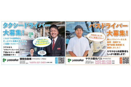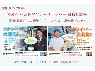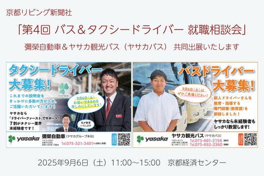彌榮自動車株式会社(ヤサカグループ本社、以下:彌榮自動車)ならびにヤサカ観光バス株式会社(以下:ヤサカ観光バス)は、2025年9月6日に行われる「第4回 バス・タクシードライバー 就職相談会 in 京都(主催:京都リビング新聞社、協力:京都府タクシー協会・京都府バス協会)」に共同で出展することをお知らせいたします。