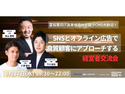 2025年9月17日(水)19:30~ affluentの高山代表・Tsumiki Techの下川代表・KASHIKAの小澤代表が幹事を務め、SNSとオフライン広告で良質顧客にアプローチする経営者の交流会を開催すると発表した。