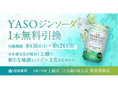 株式会社越後薬草(本社:新潟県上越市、代表取締役:塚田和志) は、2025年8月16日(土)に開催される「上越市二十五歳の成人式(令和2年度代替行事)」において、対象となる皆さまへの祝福の気持ちを込め、上越発の「THE HERBALIST YASO ジンソーダ」のプレゼント企画を実施いたします。