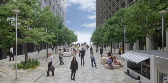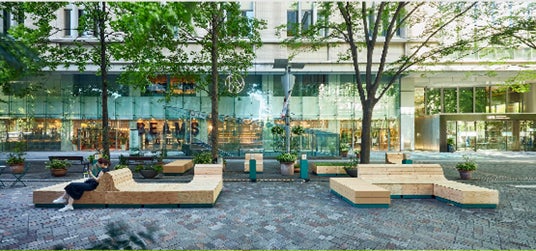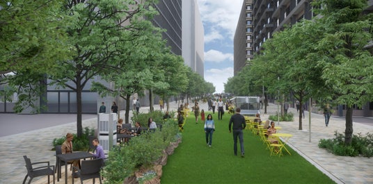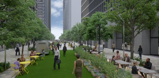 緑と道路を一体的に繋げる景観づくりを意識。全3ブロック(約300m)に及ぶ都心の道路空間に24時間の交通規制をかけ、質の高い「滞留」「回遊」空間で賑わいを生み出します。
