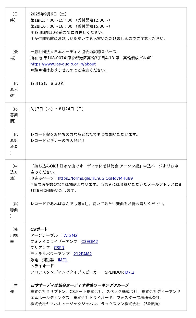 一般社団法人日本オーディオ協会(所在地:東京都港区、会長:小川理子)は、「せっかくレコードを買ったけどレコードプレーヤーをもっていない」、「ちゃんとしたオーディオで自分のレコードを聴いたことがない」といった方々に、ご自身のレコードを本格オーディオ機器で楽しんでいただきたいという思いから「持ち込みOK!好きな曲でオーディオ体感試聴会 -レコード編 Vol.2-」を開催いたします。