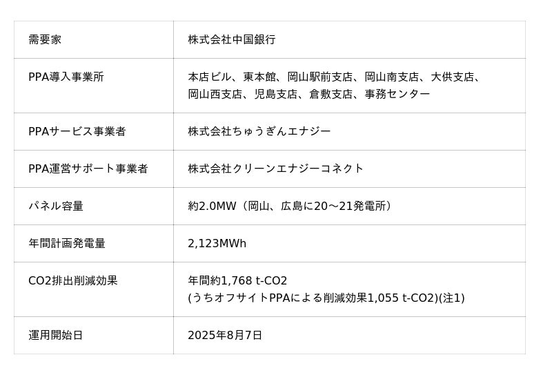 オフサイトPPAサービスの導入にあたり、株式会社ちゅうぎんフィナンシャルグループ(以下「ちゅうぎんFG」という)の株式会社ちゅうぎんエナジー(岡山県岡山市北区丸の内一丁目15番20号 ちゅうぎん本店ビル9階 代表取締役 松岡 信一、以下「ちゅうぎんエナジー」という)は、株式会社クリーンエナジーコネクト(東京都千代田区大手町2-2-1 代表取締役 内田 鉄平、以下「クリーンエナジーコネクト」という)と業務提携契約を締結して協業をおこない、地域の脱炭素の実現に向けた第1弾として、中国銀行向けにオフサイトPPAサービスを提供いたします。