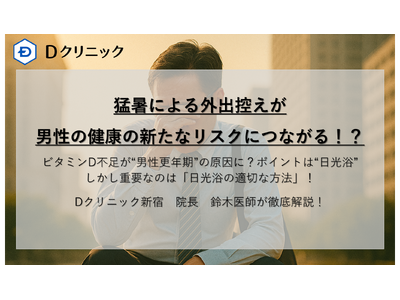 Dクリニック(東京、新宿、札幌、大阪、名古屋、福岡 計6クリニック)では、今年の猛暑による紫外線対策、そして「男性更年期」の関連性について、男性300名に対してアンケート調査※を実施いたしました。調査結果を踏まえ、Dクリニック新宿の院長である鈴木雄一郎より、紫外線と男性更年期の関連性、そして対策ついて解説いたします。