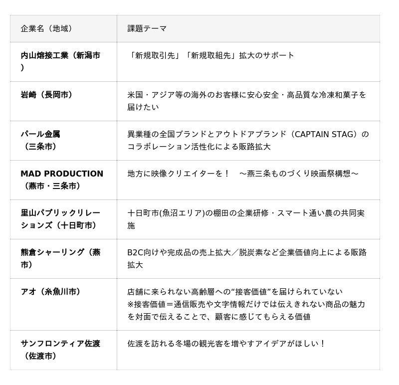 新潟県内の6市町7課題、地元企業8社8課題に対して、企業からの提案を募集しています。
