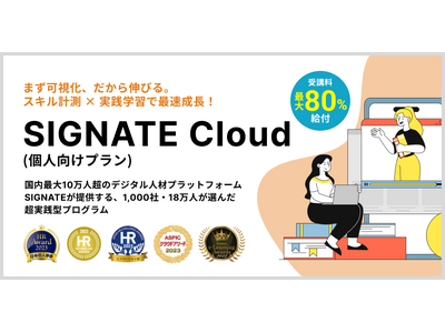 「SIGNATE Cloud(個人向けプラン)」は、法人向けに高い評価をいただいております同名サービスを、個人の皆様のリスキリングおよびキャリアアップを実現する専用サービスとしてアレンジを加え、給付金適用可能なものとして展開。提供開始以来、多様な学習ニーズを持つ多くの皆様にご利用いただいており、実践的なDXスキル習得の機会を提供しています。